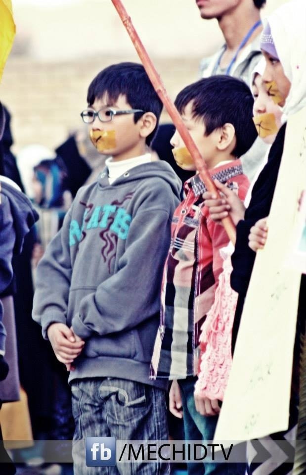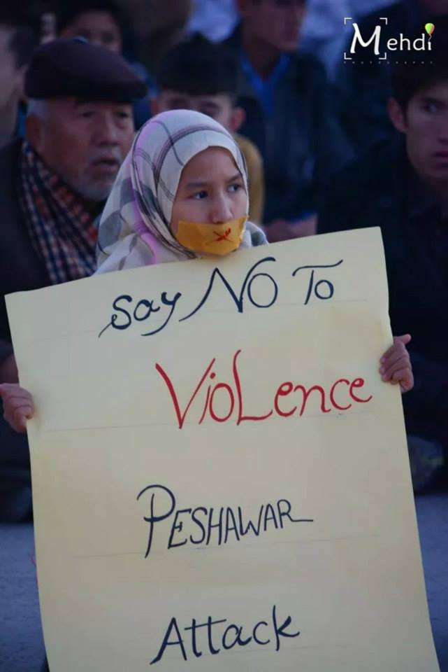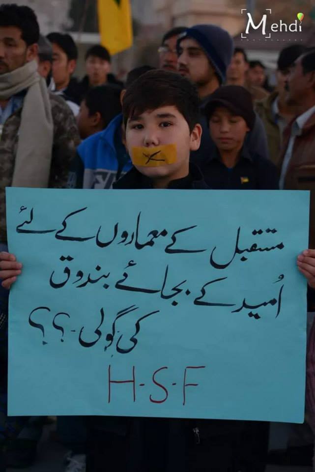 ایک بات جو بہت غیر معمولی اور اہم تھی وہ یہ کہ اپنے جیسے معصوموں کے قتل عام پر احتجاج کرنے والے تمام بچّوں کی زبانوں پہ تالے لگے ہوئے تھے ۔ ان سب کے منہ پر ٹیپ چپکا ہوا تھا اور وہ خلاف معمول شرارتیں کرنے کے بجائے گم سم تھے ۔ اس کی وجہ شاید یہ ہو کہ وہ جان چکے تھے کہ ان کے بولنے سے کوئی فرق نہیں پڑنے والا ۔ ورنہ جو لوگ گزشتہ پندرہ سالوں سے اپنے پیاروں کے قتل پرمسلسل دہائیاں دے رہے ہیں ان کی آہ وبکا کا کچھ تو نتیجہ نکلتا ۔ لہٰذا وہ کچھ نہیں بول رہے تھے یا شاید بول بول کے اور چیخ چیخ کے تھک چکے تھے ۔ ایسا بھی تو ہو سکتا ہے کہ انہیں اس بات کا احساس ہو چکا ہو کہ ان کے خون کا رنگ پشاور میں قتل ہونے والے بچّوں کے لہو کے رنگ سے مختلف ہے یا شاید ان کی آہ و فغاں میں وہ تاثیر نہیں جو ان کے محافظوں کے ضمیر کو جگا سکے ۔ اس لئے وہ چپ تھے اور کچھ نہیں بول رہے تھے ۔ لیکن لبوں کی اس خاموشی میں ان کی معصوم آنکھیں بول رہی تھیں جن سے چھلکتا ایک سوال صاف نظر آرہا تھا کہ کیا کبھی ہمارے پیاروں کے قاتل بھی پکڑے جائیں گے اور کیا کبھی ان لوگوں کو بھی تختہ دار پر لٹکایا جائے گا جن کے ہاتھ پندرہ سو ماؤں ، بچّوں بوڑھوں اور جوانوں کے خون سے رنگے ہوئے ہیں ؟