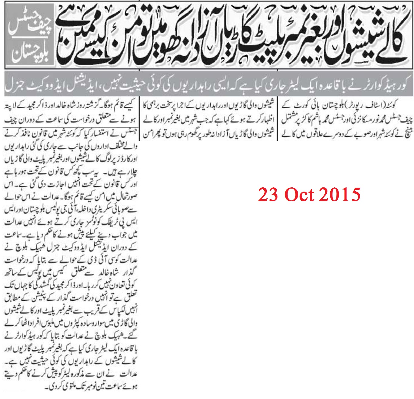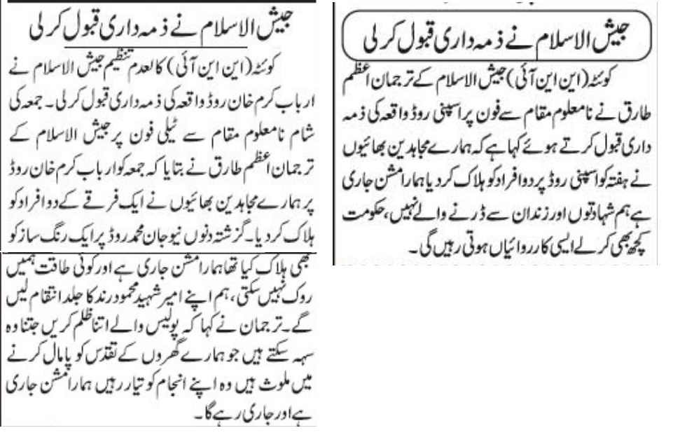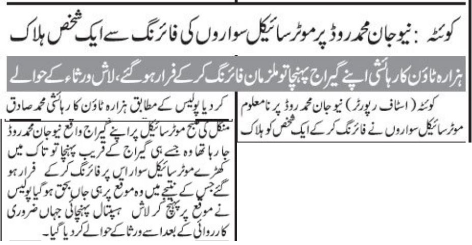 سول لائنز پولیس سٹیشن کے ایک اہلکار نے بتایا کہ دو افراد ایک گاڑی میں اسپنی روڈ سے گزر رہے تھے، جب ان کی گاڑی پہلوان بابا کے قریب پہنچی تو نامعلوم موٹر سائیکلوں سواروں نے گاڑی پر فائرنگ کر دی۔