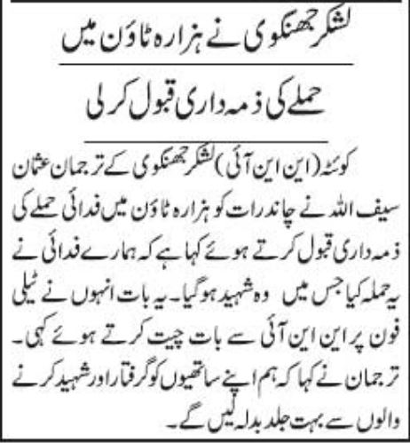 یہ حملہ جمعہ اور سنیچر کی درمیانی شب ہزارہ ٹاؤن کے قریب ہوا۔