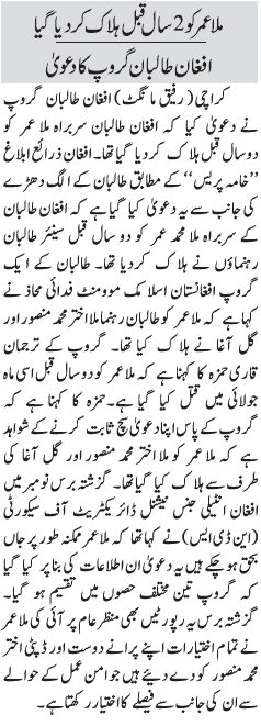 امریکی روزنامے وال سٹریٹ جرنل کے مطابق ملا اختر منصور کو پاکستان آتے ہوئے اُس علاقے میں نشانہ بنایا گیا جہاں عمومی طور پر ڈرون حملے نہیں ہوتے ہیں۔