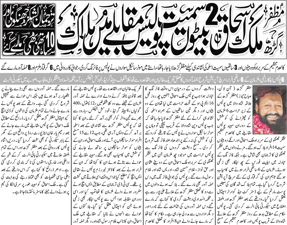پاکستان کے صوبے پنجاب کے ضلع مظفرگڑھ میں حکام کے مطابق بدھ کی صبح پولیس کی ایک کارروائی کے دوران کالعدم شدت پسند تنظیم لشکرِ جھنگوی کے بانی و سابق امیر ملک اسحاق سمیت 14 شدت پسند ہلاک ہوگئے ہیں۔