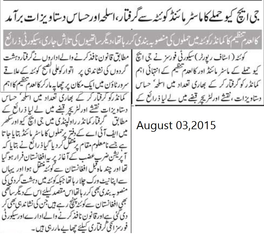انھوں نے کہا کہ ہلاک دہشت گردوں کا تعلق کالعدم تنظیم سے ہے اور وہ کوئٹہ میں دہشت گردی کی سرگرمیوں میں ملوث تھے۔
