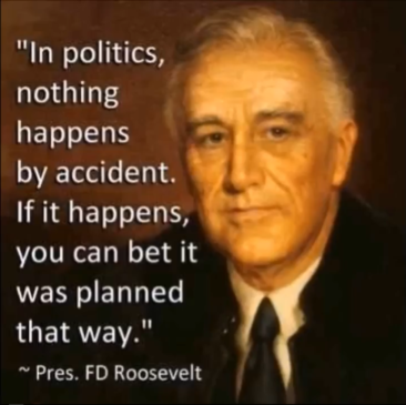 امریکی صدر روزویلٹ نے کہا تھا کہ "سیاست میں کوئی بھی واقعہ اتفاقی رونما نہیں ہوتا، اگر کوئی واقعہ رونما ہو جائے  تو جان لیں کہ اس کے لئے ایسی ہی منصوبہ بندی کی گئی تھی”۔ یاد رہے کہ یہ وہی فرینکلن ڈیلانو روزویلٹ ہے جن کے بارے تصور کیا جاتا ہے کہ وہ ایلومیناٹی کے ایک اہم رکن تھے۔