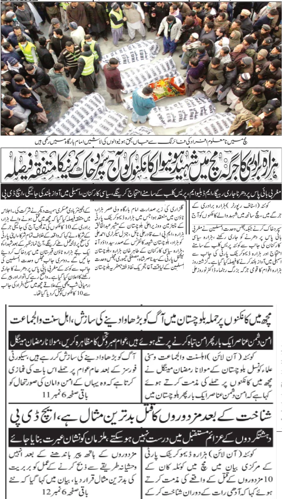 سنیچر کی شب مچھ میں واقع کوئلہ فیلڈ میں نامعلوم مسلح افراد کے حملے میں کم از کم 10 کان کن ہلاک ہو گئے تھے، ان تمام مزدوروں کا تعلق بلوچستان کی ہزارہ کمیونٹی سے ہے۔ ہلاک ہونے والوں کے لواحقین صوبائی دارالحکومت کوئٹہ کے مغربی بائی پاس پر میتوں سمیت دھرنا دیے بیٹھے ہیں اور انھوں نے اس عزم کا اعادہ کیا ہے جب تک ان کے مطالبات تسلیم نہیں ہوتے تب تک وہ نا تو میتوں کی تدفین کریں گے اور نا ہی دھرنا ختم کریں گے۔